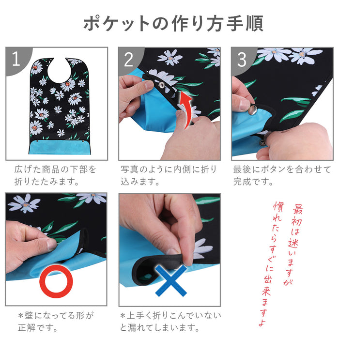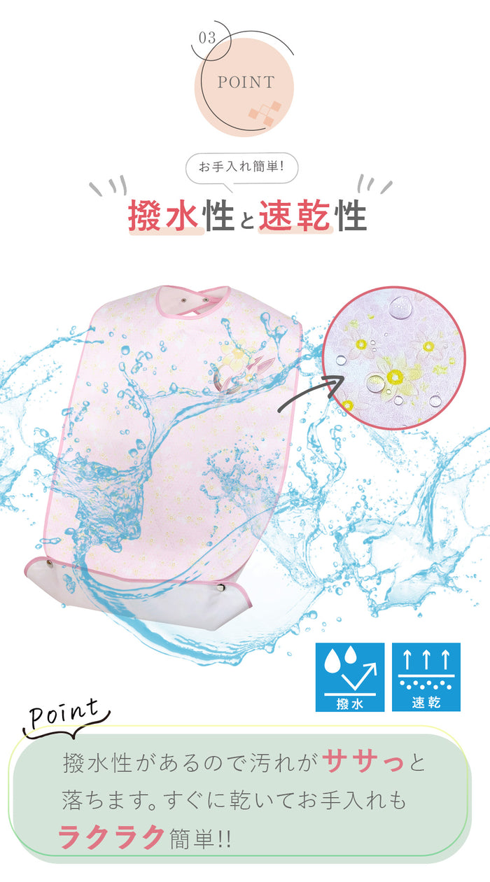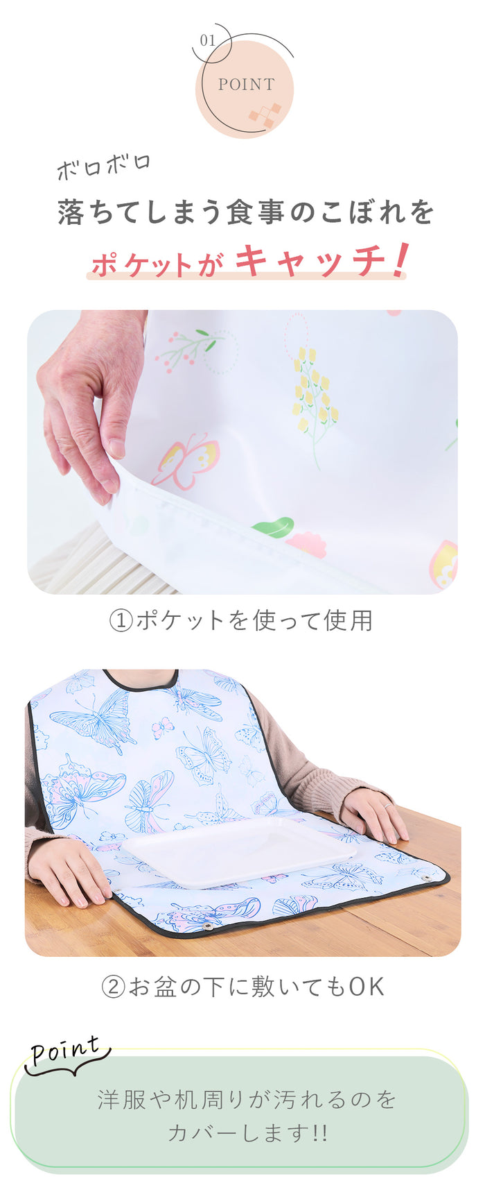 高齢の母に使いましたが、ボタンも留めやすく、袋になり食べこぼしがポケットに収まる点が便利です。