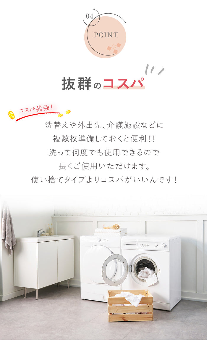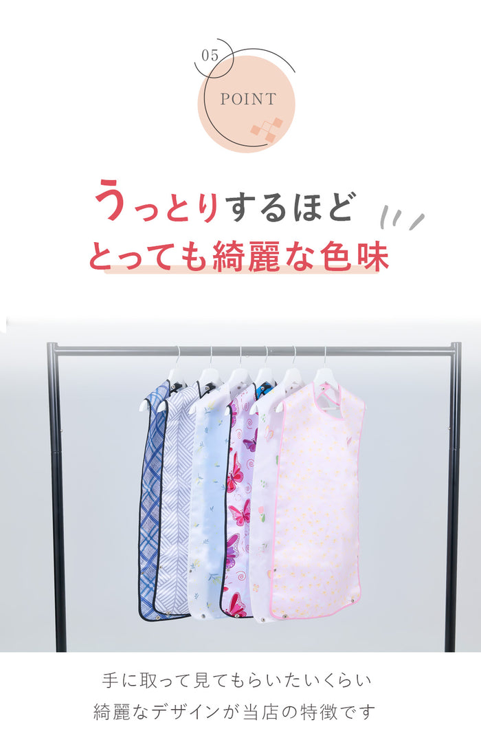 転院先の病院でエプロンを用意してくださいと言われ、急遽購入しました。直前の病院では使っている人がいなかったので、病院によって違うのだなと。食が細くなった母が少しでも明るい気持ちで食事をしてくれたらと思い選びました。たくさんの色から選び、首元の留めもマジックテープ、ボタン、紐と選べるので母を思いながら選びました。生地はツルツルしていて拭き取りやすく、洗濯も躊躇なくできます。